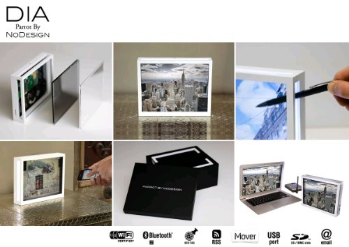 Einzigartige TechnologieDie Originalität des Rahmens erregt unmittelbar Aufmerksamkeit. Display und Beleuchtung wurden bewusst an separaten Stellen untergebracht.Ein Hauch von Vergangenheit - die Reinheit eines innovativen Designs Der Zauber eines einzigartigen Displays, die Reinheit arktischer Weiße und die Erinnerung an Dias längst vergangener Zeiten. Das werden auch Ihre Gedanken und Empfindungen sein, wenn Sie den Fotorahmen betrachten. Seine widersprüchliche Gestaltung erinnert Sie mit Sicherheit an Ihre ersten Kinobesuche, gleichzeitig integriert sich der Rahmen perfekt in jedes moderne Dekor.LichtprojektionGenau wie bei einer Kinoleinwand, auf die der Film projiziert wird, wurde DIA für eine Projizierung Ihrer Schnappschüsse konzipiert.Durchscheinender Schirm Transparenter, hochauflösender LCD Bildschirm mit 10,4 Zoll Diagonale. Das Display, auf dem die Fotos angezeigt werden, ist lichtdurchlässig.Dadurch wird die Wirkung eines digitalen Ektachrome® Bilds erzeugt.Berührungsempfindliche Tasten Navigieren Sie einfach durch Bilderrahmen, indem Sie die berührungsempfindlichen Tasten nutzen.